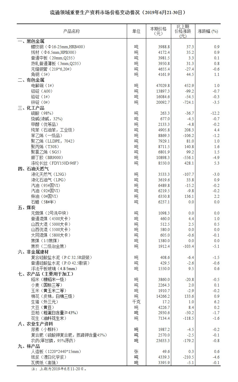 據對24個省(區、市)流通領域9大類50種重要生產資料市場價格的監測顯示,2019年6月下旬與6月中旬相比,21種產品價格上漲,25種下降,4種持平。