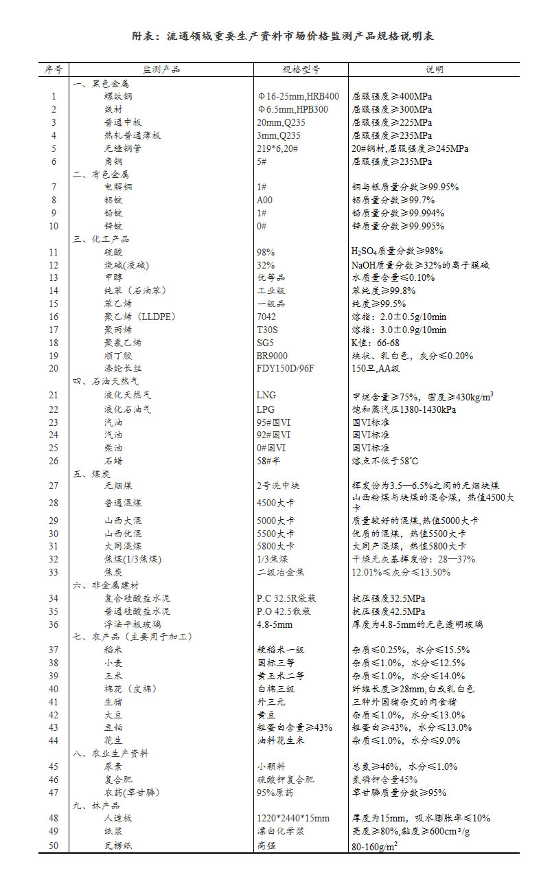 流通領域重要生產資料市場價格監測內容包括9大類50種產品的價格。類別與產品規格說明詳見附表。