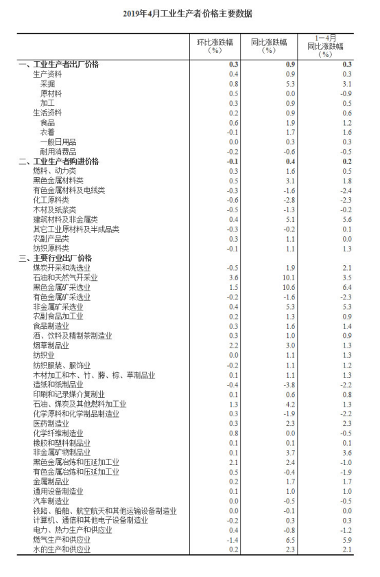 2019年4月份,全國(guó)工業(yè)生產(chǎn)者出廠價(jià)格同比上漲0.9%,環(huán)比上漲0.3%;工業(yè)生產(chǎn)者購(gòu)進(jìn)價(jià)格同比上漲0.4%,環(huán)比下降0.1%。1—4月平均,工業(yè)生產(chǎn)者出廠價(jià)格比去年同期上漲0.3%,工業(yè)生產(chǎn)者購(gòu)進(jìn)價(jià)格上漲0.2%。
