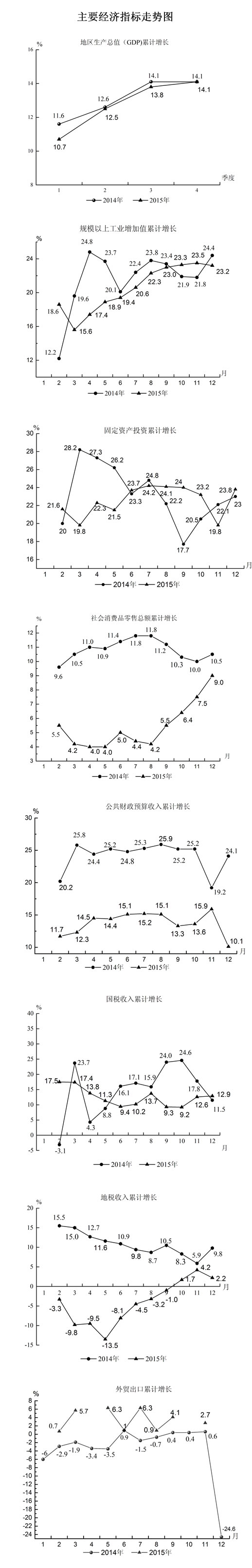 今年以來,在國內形勢總體平穩的大形勢下,全縣主要經濟指標總體呈現逐步轉好勢頭。據市統計局核定,一季度、上半年、前三季度及2015年全縣地區生產總值分別增長10.7%、12.5%、13.8%和14.1%,增速由年初逐步上升,全年達最高水平。2015年,全縣實現地區生產總值547.12億元,增長14.1%,增幅比去年持平。其中,第一、第二、第三產業增加值分別增長3.9%、20.5%和5.7%,三大產業結構為8.4:54.1:37.5,三次產業對經濟增長的貢獻率分別為2%、83.6%和14.4%,分別拉動GDP增長0.3個、11.8個和2個百分點。