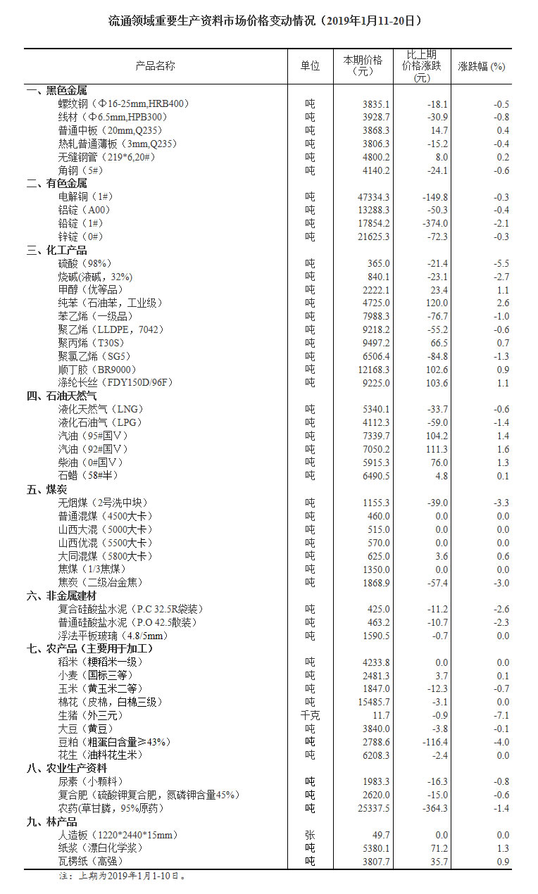 據對24個省(區、市)流通領域9大類50種重要生產資料市場價格的監測顯示,2019年1月中旬與1月上旬相比,15種產品價格上漲,26種下降,9種持平。