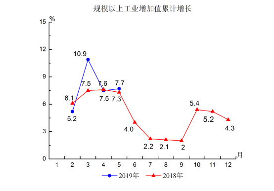 1.工業產銷總體平穩。1-5月,規上工業總產值、銷售產值分別增長10.5%和12.6%,產銷率達99.1%,同比提高1.9個百分點;實現增加值增長7.7%,增速較1-4月提高0.2個百分點。面對國內經濟下行壓力,民營企業與小微企業表現出更強韌性和更大潛力。民營工業實現較快增長。1-5月,民營工業增加值增長13.9%,快于整體規上工業6.2個百分點,占規上工業增加值比重為54.1%,同比提高2.7個百分點。小型企業引領工業增長。1-5月,小型企業增加值增長16.2%,快于整體規上工業8.5個百分點,快于大中型企業15.9個百分點。