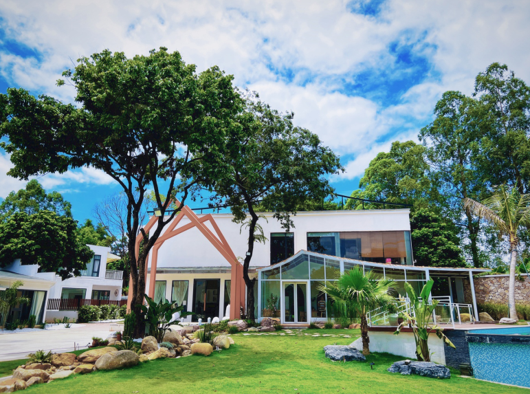 民宿內多棟主題別墅錯落嵌在綠意中,現代設計與自然意趣相融,配套了游泳池、兒童游樂設施等,吸引了眾多游客前來體驗。