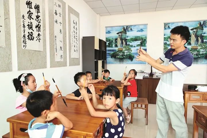 在博羅縣泰美鎮車村村新時代文明實踐站,志愿者在教小朋友學書法。惠州日報記者鐘暢新 攝